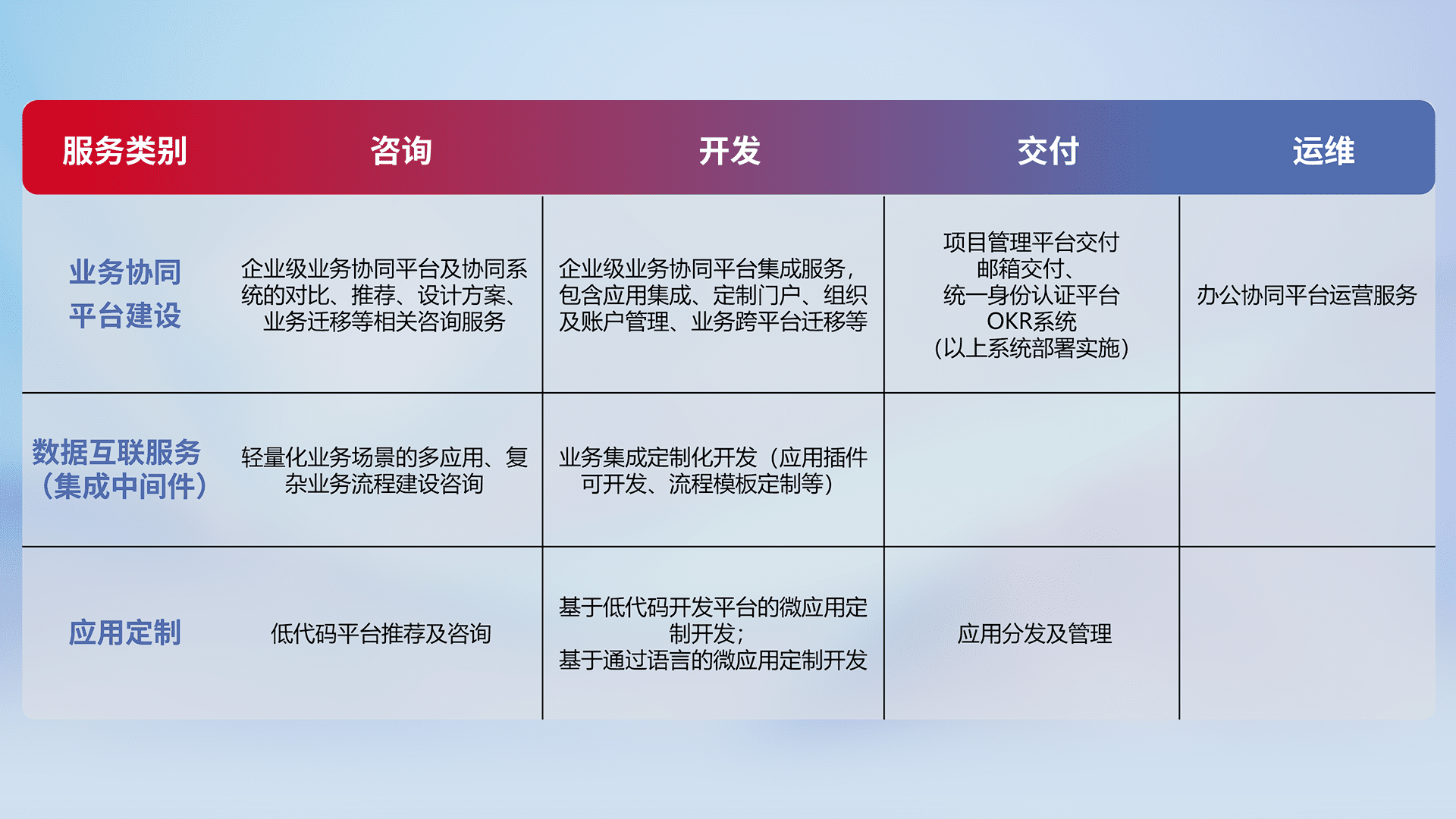 针对钉钉、、、、企微、、IDaas等平台级产品提供产品的规划、、方案、、、、交付、、、、定制化开发等服务,,,,实现如统一协同办公、、、、智能客户服务、、混合会议管理、、智能数据查询、、等业务场景,,,实现数字化转型。。。。